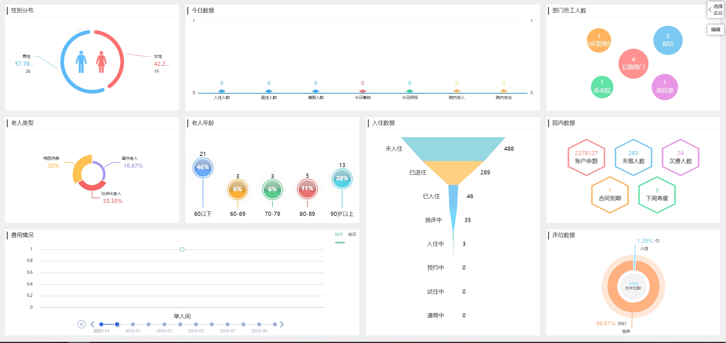 老人或老人子女可以根據自身的情況,選擇試住、階段性住宿和長期住宿等幾種方式,然后根據住宿類型繳費。既方便老人和子女,也方便養老院,尤其是費用清單管理和費用結算管理,非常有利于養老院進行成本分析和預算管理。